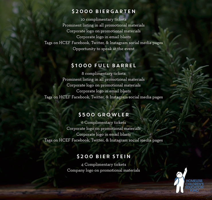 We hope you will consider sponsoring an event that will raise awareness and funding for Homeless Children’s Education Fund (HCEF), an organization dedicated to helping students who are unstably housed. The proceeds will go to supporting the mission and programs that support young people in our neighborhoods—including tutors, mentors, material supplies, and referrals for needed services. If interested in sponsoring, please contact MJ Meenen at HCEF (mjmeenen@homelessfund.org). Take a look at our sponsorship levels below.