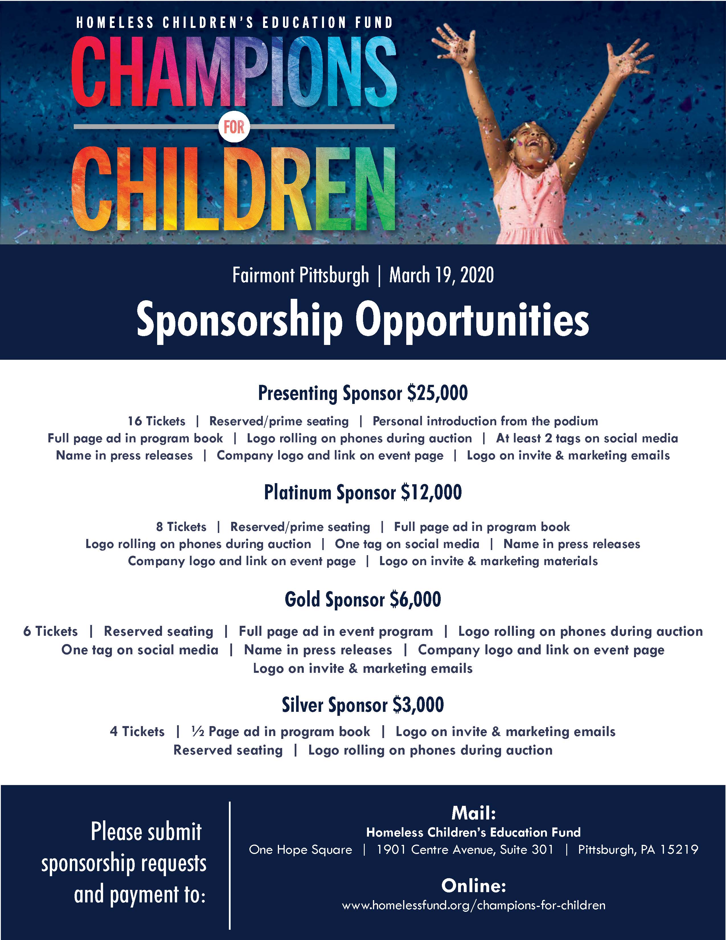 We hope you will consider sponsoring Champions for Children to raise funding to help students who are unstably housed. The proceeds will support programs that support young people in Allegheny County—including tutoring, mentorship, material supplies, and referrals for needed services. If interested in sponsoring, please contact MJ Meenen at mjmeenen@homelessfund.org or 412-562-0154. Take a look at our sponsorship levels below.